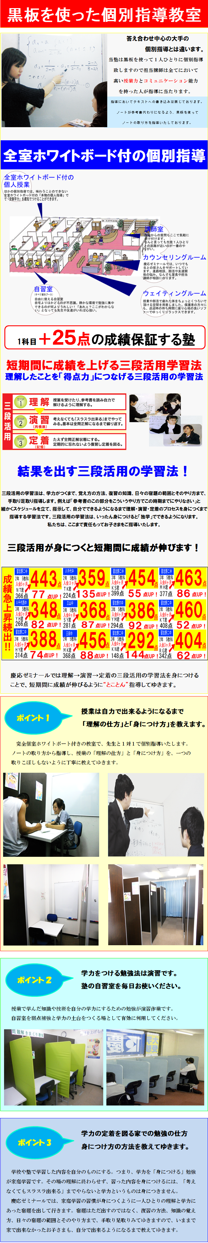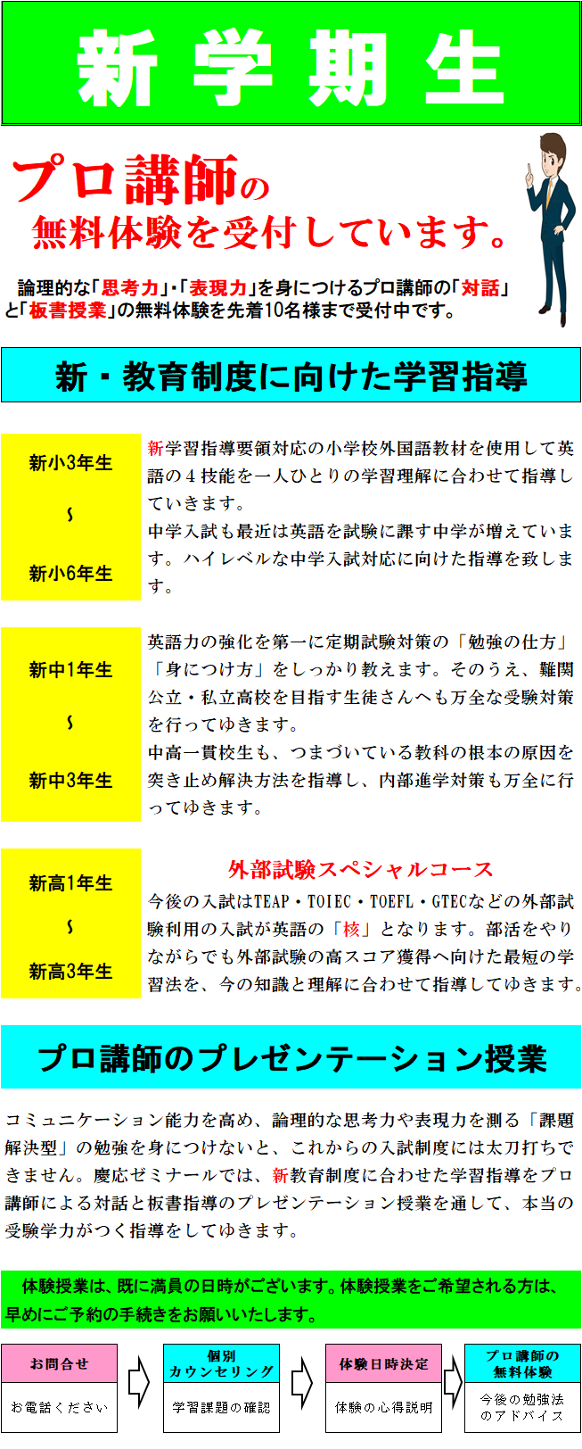「部活から帰ったらご飯を食べて、ゲームをやって寝るだけ」「塾に行っているんだけど、全然伸びなくて・・・。」 「うちの子英語が苦手・・・。」などなど、勉強の悩みはお任せください!悩みの原因を探り出し、いまのお子さまに合ったムダのない勉強法や対策など丁寧にアドバイスしていきます。